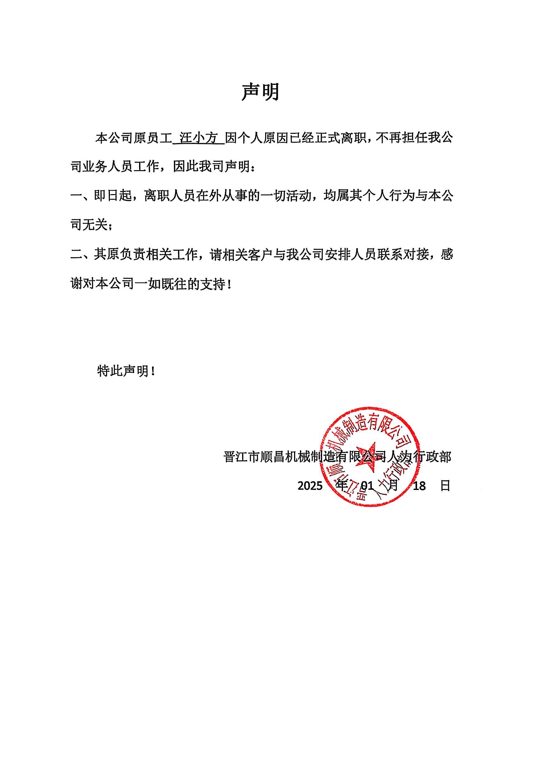 关于业务人员汪小方离职声明