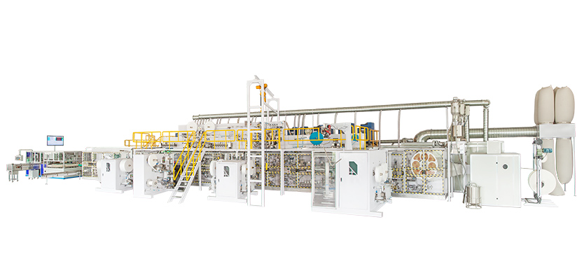 Basic process configuration: High speed pulverizer(untreated pulp is allowed) Fluff forming unit SAP dosing unit Raw material feeding units Inner core cutter unit Inner core turning unit Waist elastics application unit Central folding unit Final cutter unit Air application unit Safety protection unit |